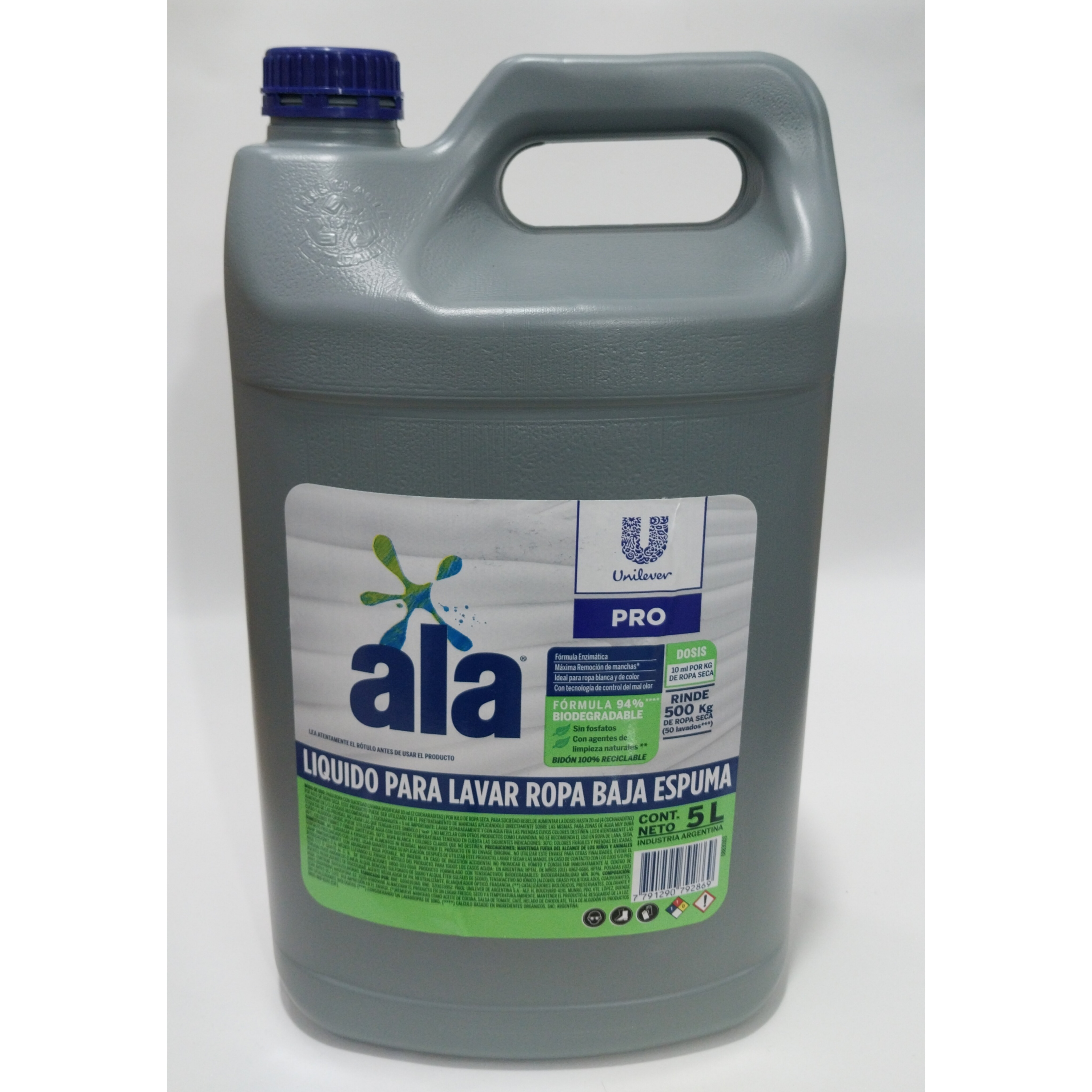 Bidon ALA Liquido para Lavar Ropa Baja Espuma 5 Lts [Rinde 500 Kg] x unidad.